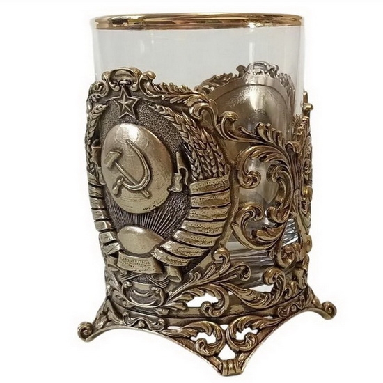 Стакан для виски Герб СССР латунный, литой. Высота со стаканом 11 см., длина 8 см., ширина 8 см., объем 310 мл., вес 550 гр. Герб Советского Союза на латунном обрамлении стакана для виски «СССР» наполнит гордостью каждого бывшего гражданина некогда великой страны. Гербовая символика органично сплетается с витиеватым узором, что придаёт сувениру роскошный вид. Такой подарок носит не только памятный, но и функциональный характер – из стеклянного стакана приятно пить виски и любоваться декором. Стакан привлекает внимание уникальным дизайном – он выполнен из латуни с помощью технологии художественного литья. Хороший подарок для себя, родных и друзей. Ручная работа.