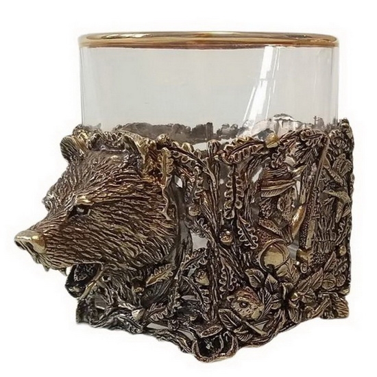 Стакан для виски Медведь латунный, литой. Высота со стаканом 9,5 см., длина 13,5 см., ширина 9 см., объем 310 мл., вес со стаканом 750 гр. Изысканный стакан для виски Медведь украшен оригинальным четырёхгранным латунным обрамлением ручной работы. Здесь можно увидеть голову разъярённого медведя, прицеливающегося охотника, собаку, охотничий рожок. Надпись «Лучшему охотнику» конкретизирует назначение стакана. Стакан привлекает внимание уникальным дизайном – он выполнен из латуни с помощью технологии художественного литья. Хороший подарок для себя, родных и друзей. Ручная работа.