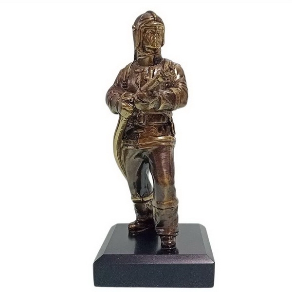 Статуэтка из бронзы Пожарный на подставке из змеевика. Размер с подставкой: высота 17,5 см., длина 7,5 см., ширина 7,5 см., вес 900 гр. Полезный подарок для сотрудников МЧС и коллекционеров.