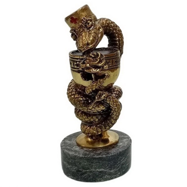 Статуэтка из бронзы Змея медсестра. Высота 11,5 см., длина 5 см., ширина 5 см., вес 320 гр. Симпатичная змейка с розочкой обвивает кубок. Змея символизирует мудрость, живучесть, бессмертие, целительные силы. Способность змеи сбрасывать кожу и появляться заново сделала её мощным символом возрождения и трансформации. Изящно выполненная, она станет изысканным украшением, где бы Вы ни расположили статуэтку. Роскошный подарок, который будет радовать многие года. Ручная работа, могут быть небольшие изменения. Бронзовые изделия отличаются прочностью, устойчивостью к коррозии и изысканным внешним видом. Бронза способна передать мельчайшие элементы и детали, выразить эмоции персонажа и в совершенстве воплотить задумку автора.Во все времена бронза была символом благородства, аристократичности и безупречного вкуса. Большой популярностью пользуется антикварная бронза, искусственно состаренная при помощи патинирования. Бронзовые изделия способны пережить века, а художественное литье из бронзы всегда ценилось как виртуозное искусство.